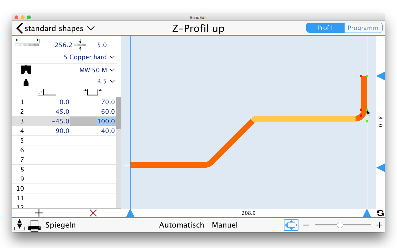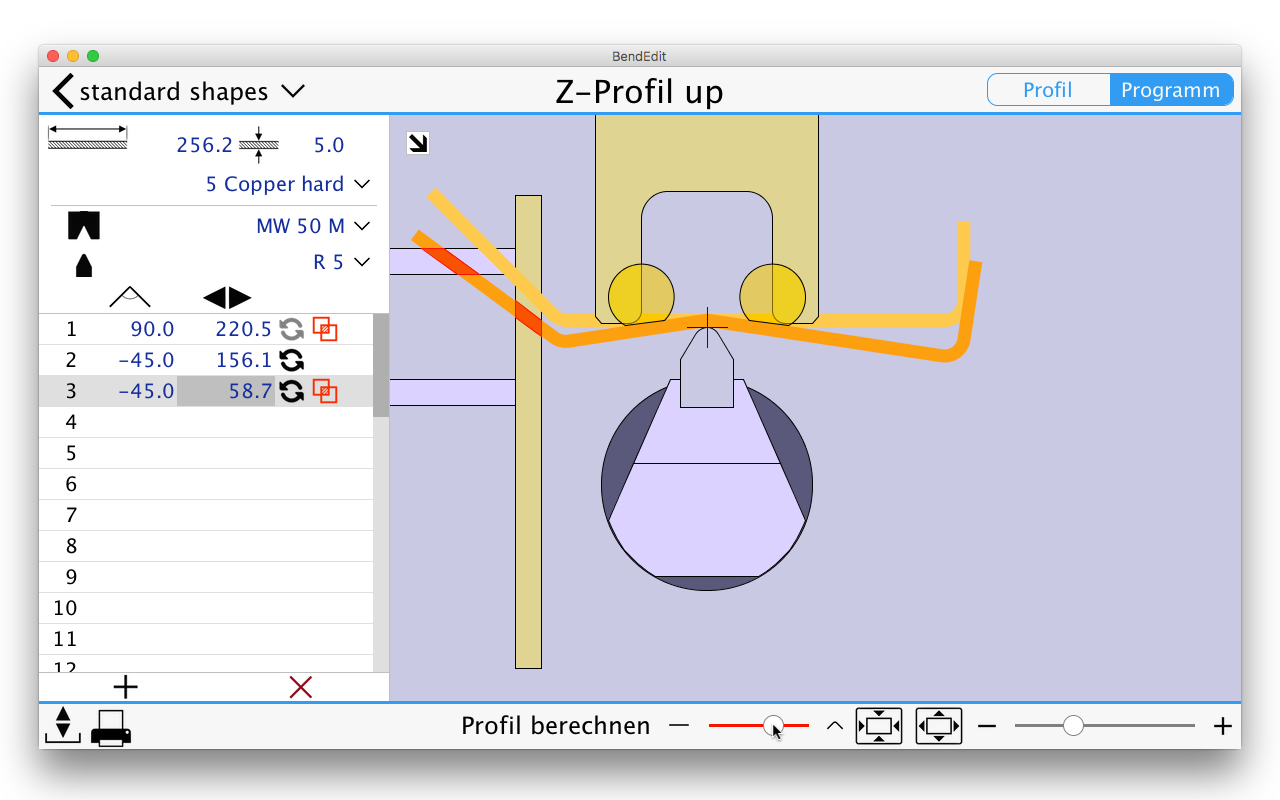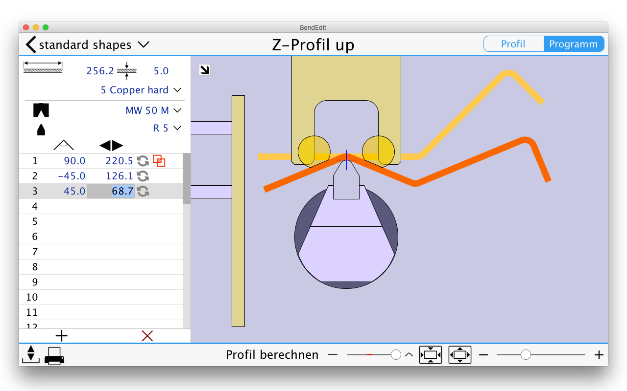 BendEdit hat einen mächtigen, einfach zu bedienenden Profileditor zum schnellen Erstellen und Vermessen vor Biegeteilen.