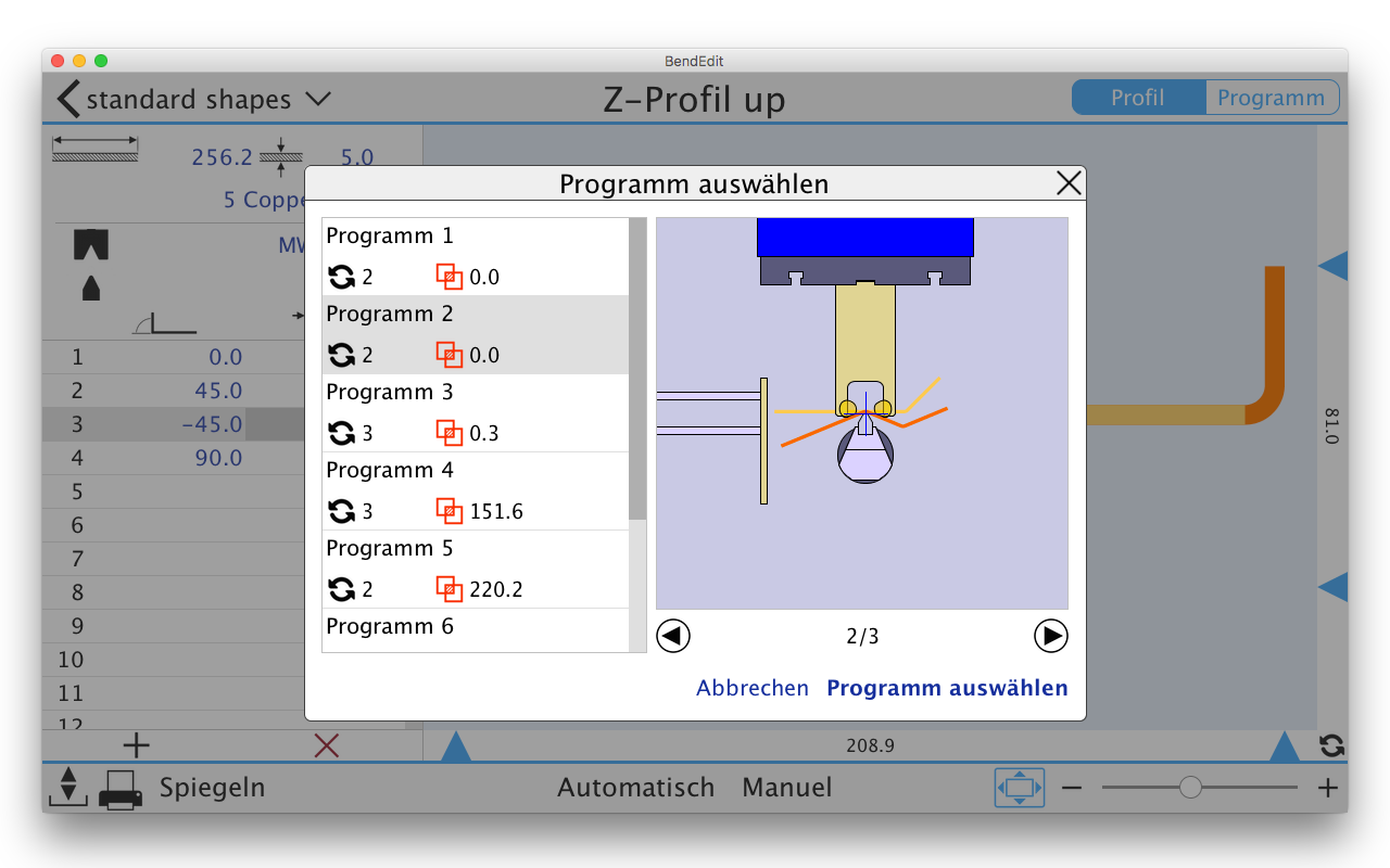 BendEdit präsentiert die besten Programme in einer Liste. Die Programme können Schritt für Schritt durchgegangen werden, und das gewünschte Programm kann ausgewählt werden.